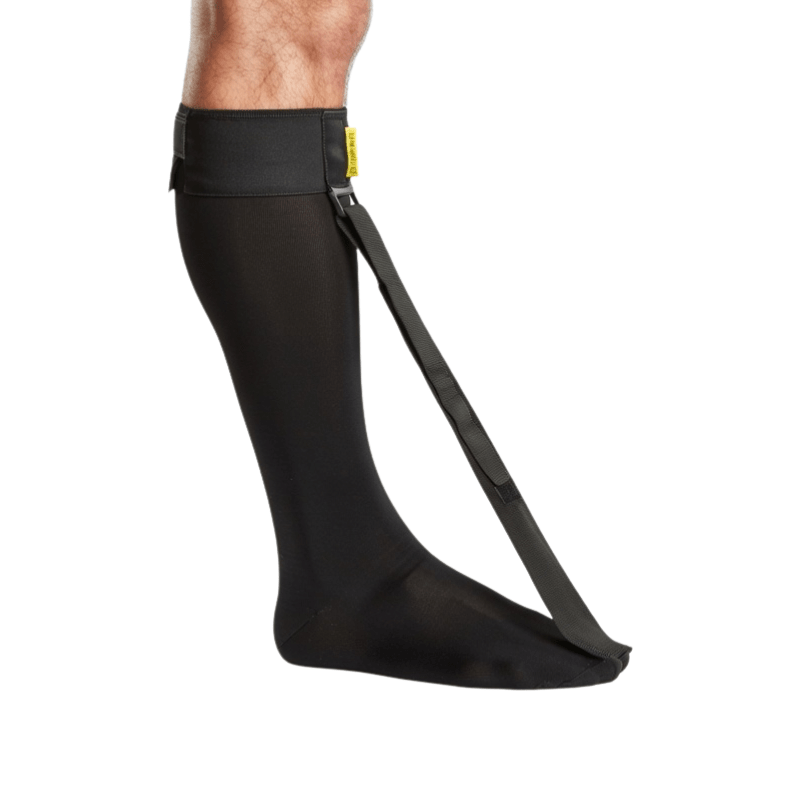 Musta, joustava Strassburg-sukka, joka on suunniteltu yökäyttöön jänteiden kiinnityskohtien tulehduksen tai kantaluupiikin hoitoon. Sukka venyttää plantaarifaskiaa yön ajan, ja näin tukee kudoksen paranemista.