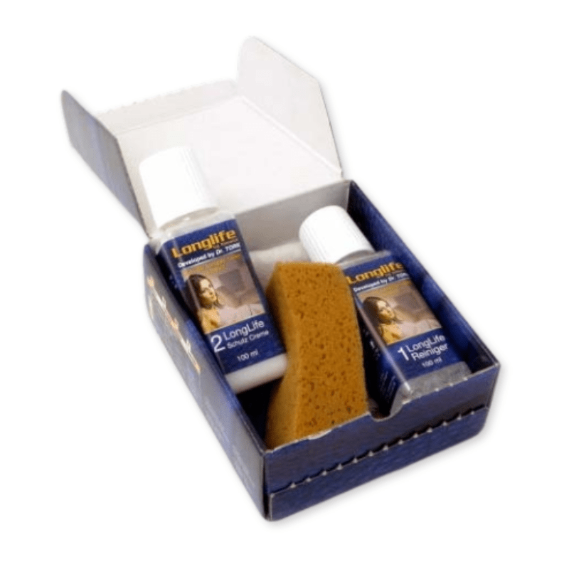 Hoitosetti nahkakalusteiden ylläpitoon. Setti sisältää puhdistusnesteen, balsamin, sienen ja liinan. Helppokäyttöinen. Puhdistusnestettä käytetään ennen balsamin levittämistä. Kun käytät balsamia nahkakalusteiden ylläpitoon, nahka ei kuivu ja samalla siitä tulee likaa hylkivä.