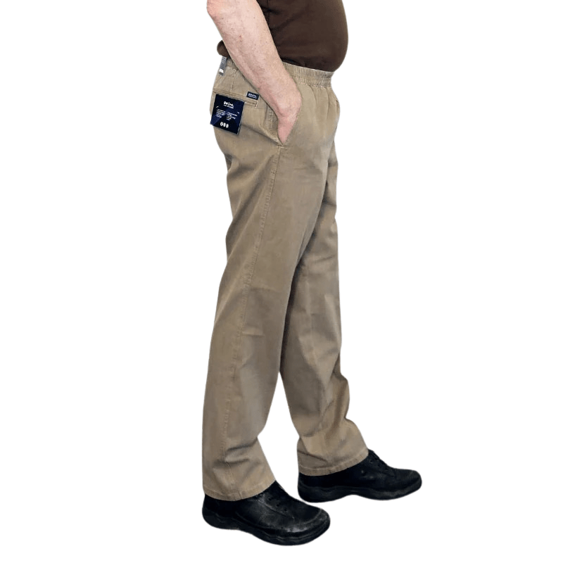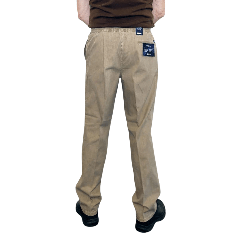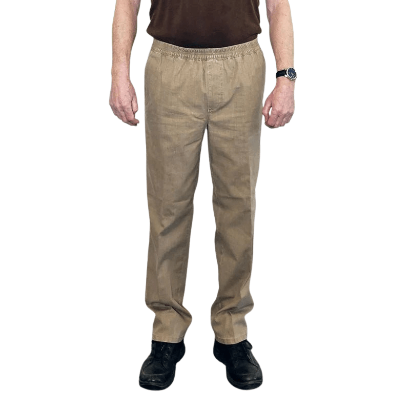 Flotte, klassiske bukser med bred elastikkant i let og slidstærkt bomuld med struktur. Farven er en varm sand, der passer godt til både hverdag og festlige lejligheder. Bukserne har hverken lynlås eller besværlige knapper, så de er nemme at tage af og på.