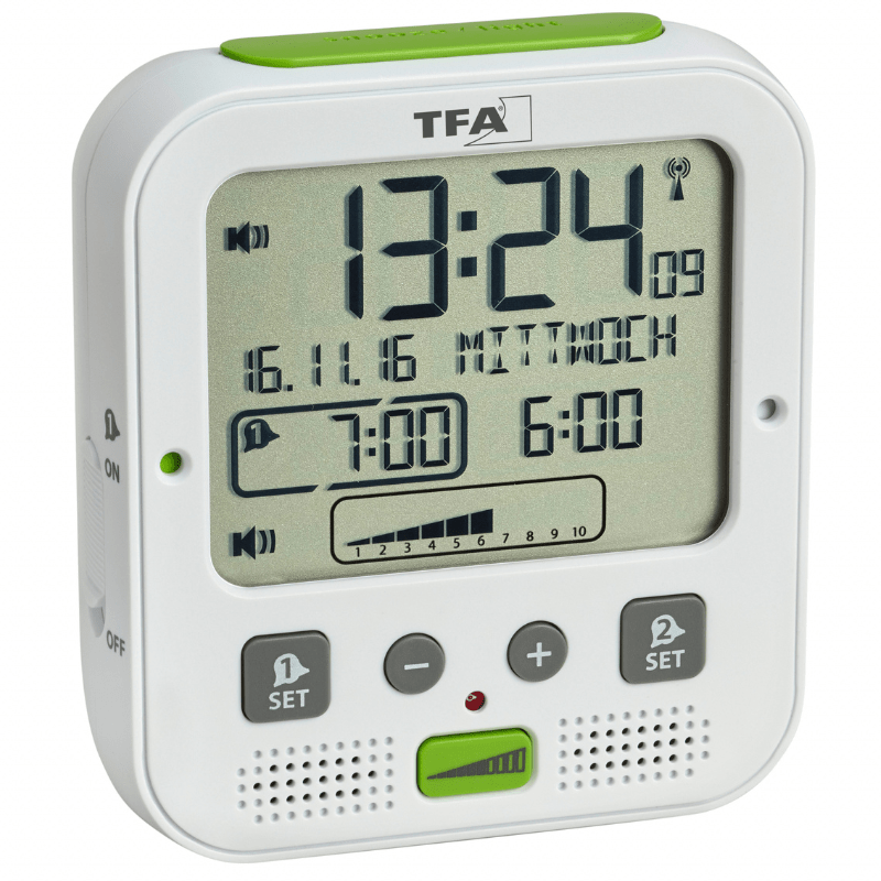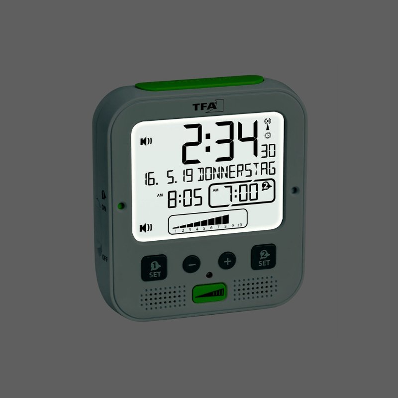 Tämä langaton herätyskello on suunniteltu sinulle, joka tarvitset erityisen tehokkaan hälytyksen. Kello yhdistää korkean äänen, voimakkaat värinät ja vilkkuvan valon – joten heräät varmasti ajoissa, olitpa sitten syväuninen tai kuulosi on heikentynyt. Kaikkia näitä toimintoja voidaan yhdistää toisiinsa ja säätää yksilöllisesti.