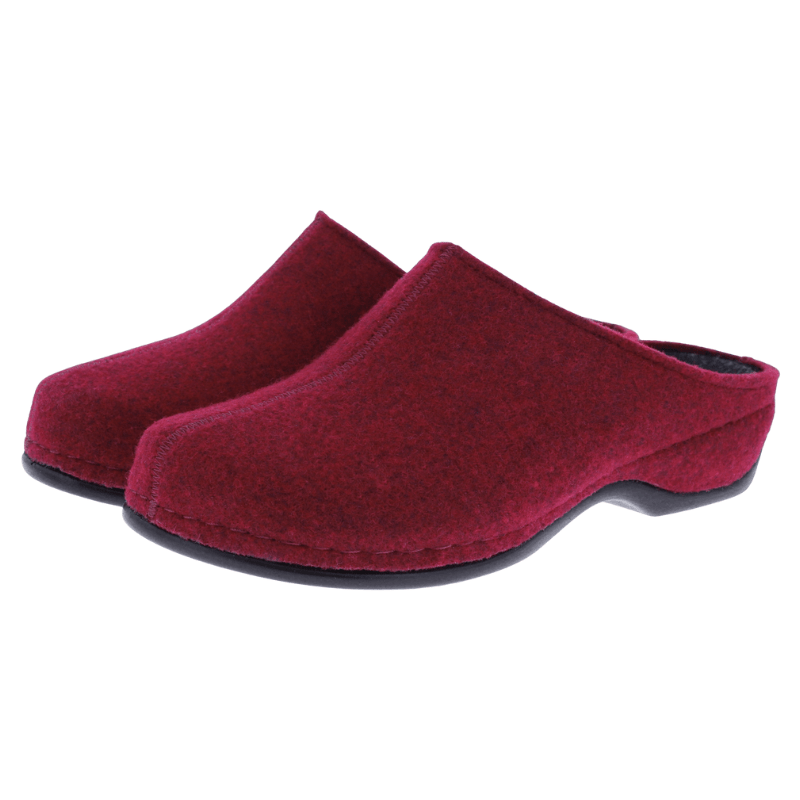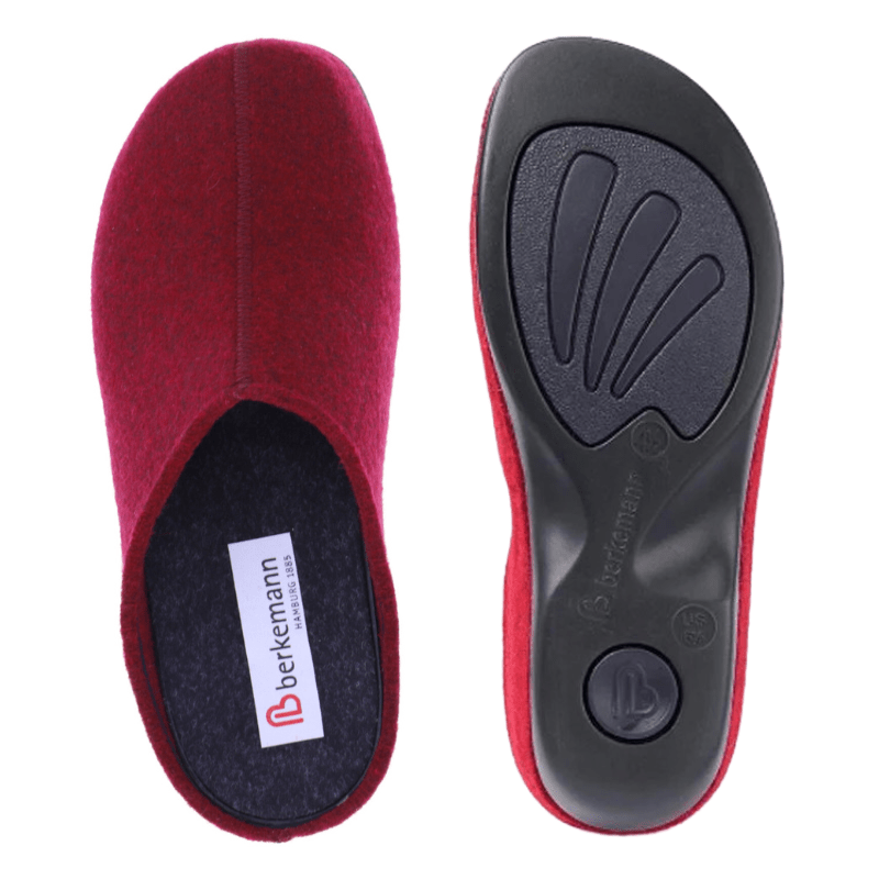 Mukavat Berkemann-kotitossut tummanpunaisesta huovasta, joka tarjoaa lämpöä ja mukavuutta kylminä päivinä. Pehmeä huopamateriaali mukautuu jalkojen muotoon ja takaa kevyen ja joustavan istuvuuden.