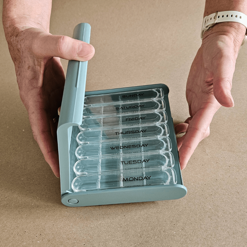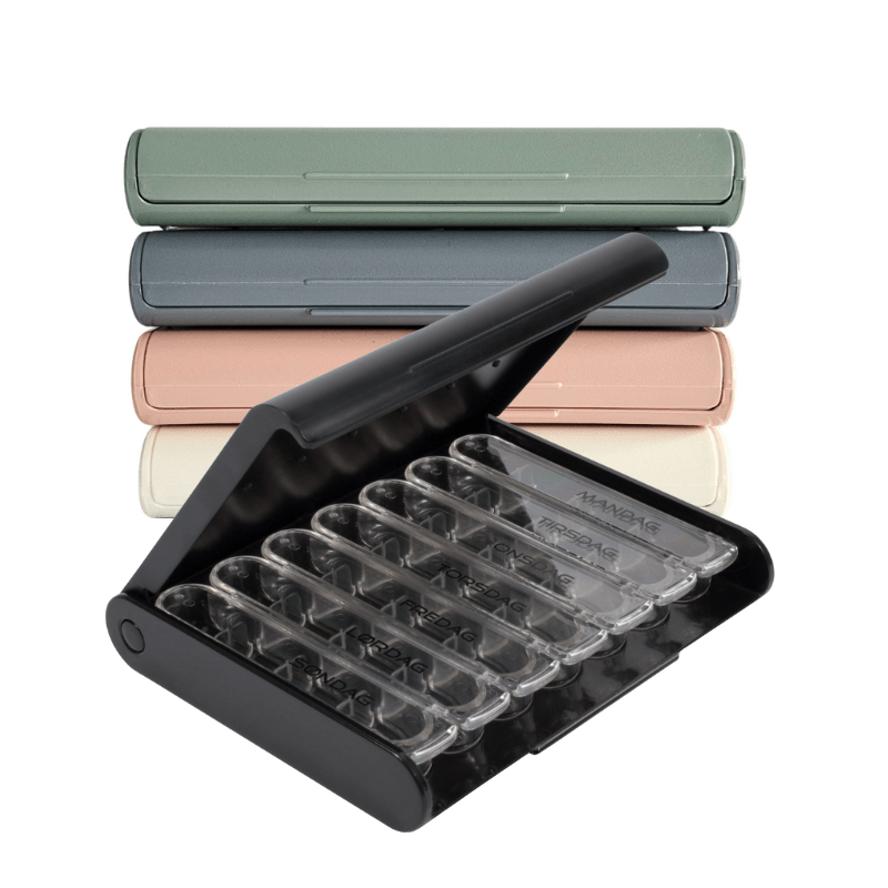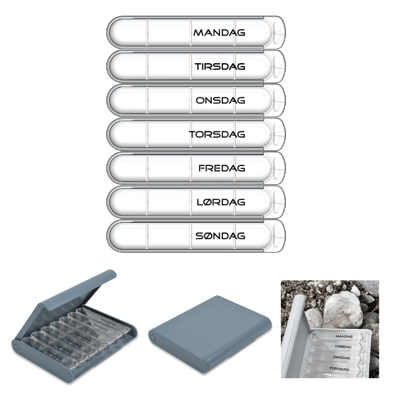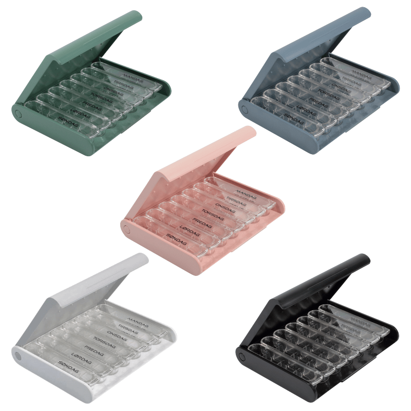 Tyylikäs tablettirasia kauniissa väreissä, yksinkertaisella ja toiminnallisella tanskalaisella designilla. Tablettirasia sisältää 7 annosrasiaa - yhden jokaiselle viikonpäivälle. Annosrasiat on jaettu 4 lokeroon, mikä mahdollistaa jopa 4 annosta päivässä.