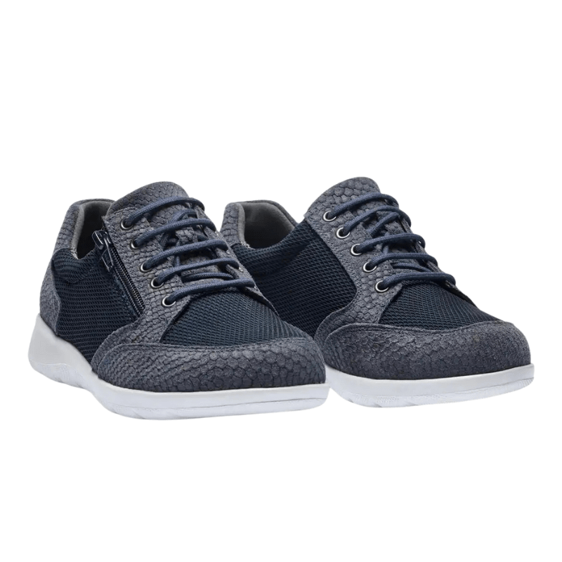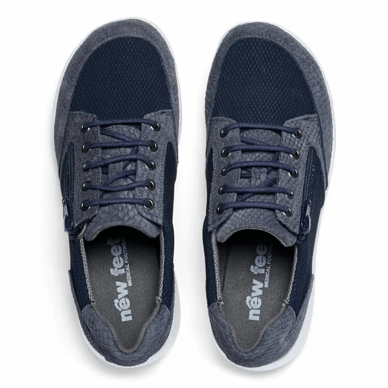 Tyylikäs tummansininen New Feet sneaker, jossa on sekoitus mokkanahkaa ja tekstiiliä ja upeita käärmeennahkaa muistuttavia yksityiskohtia. Kengässä on sekä nauhat että vetoketju, joten se on helppo pukea ja riisua sekä mukauttaa istuvuuteen.