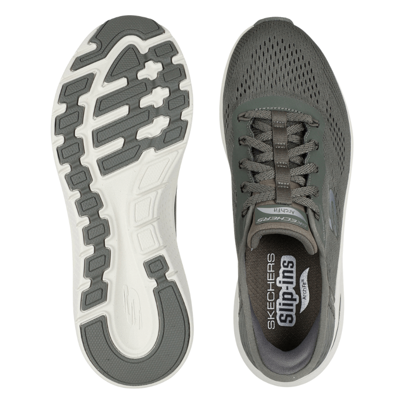 Joustava ja kevyt slip-in naisten sneaker Skechersiltä oliivinvihreästä kankaasta, jossa on vedenpitävä kalvo ja Arch Fit -teknologia, joka tarjoaa kohdennettua jalkaholvituen.